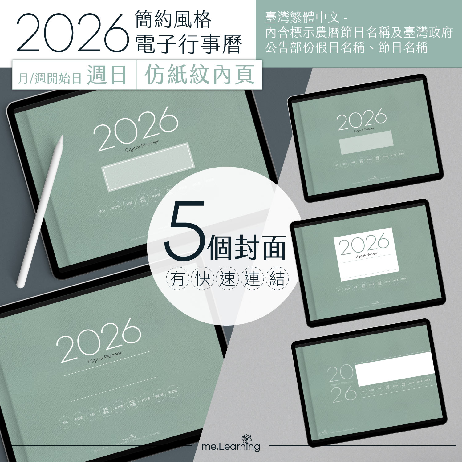 封面仿布紋簡約設計,5款設計皆有快速跳轉捷徑按鈕。