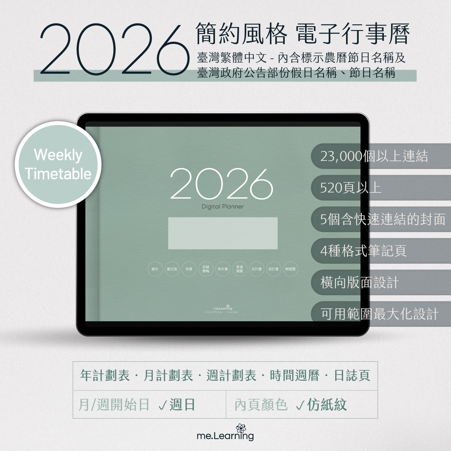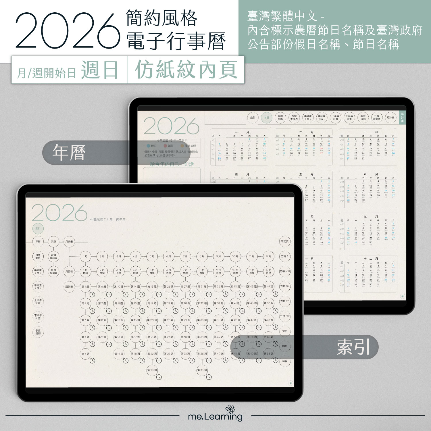 電子行事曆 2026+時間曆-Sunday Start-仿紙紋-臺灣繁體中文(農曆)